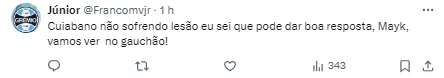 No próximo domingo (10), o técnico Renato Portaluppi já deve promover a entrada de Mayk, contra o Brasil de Pelotas, na Arena, às 18h30 (de Brasília), pelas quartas de final do Gauchão, segundo o portal GZH.