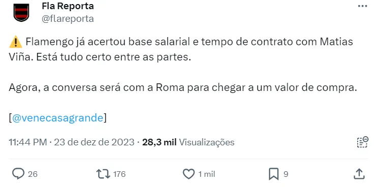Matías Viña chegou a um acordo para jogar no Flamengo e o clube carioca agora conversa com a Roma sobre o valor da compra. Entre atleta e o clube carioca, tudo ok, informa Venê Casagrande.
