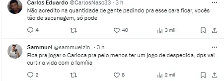 E não deve ficar para 2024. Algumas equipes estão interessadas na contratação do atacante – um deles é o Athletico, segundo informações do jornalista Fábio Azevedo -, porém, também existe a possibilidade do atleta se aposentar. Ele já conquistou sua independência financeira e não gostaria de sair do Rio de Janeiro.