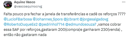 A 777 também tem que entender que mesmo com todo processo de aprovação, as decisões não podem demorar, pois o Vasco pode perder mais um nome para outra equipe e o prazo está acabando e as competições vão começando. A equipe estreia nesta terça (27) na Copa do Brasil e logo mais o Brasileirão inicia.