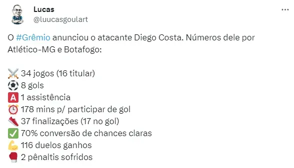 A experiência do jogador pode ser fundamental para a disputa da Libertadores. Além disso, quando esteve em forma, Diego Costa exibiu boas apresentações. Tem tudo para dar certo ao lado de Soteldo.