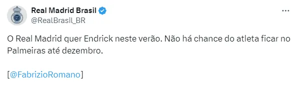 O Palmeiras perderá Endrick no meio do ano. Considerado uma das maiores promessas do futebol brasileiro, o jogador rumará ao Real Madrid para a próxima temporada do futebol europeu.