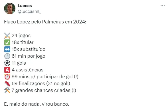 O que também vem chamando a atenção dos torcedores e rendendo críticas até mesmo a Abel Ferreira, é a ausência de Flaco López no time titular. O jogador vem perdendo espaço nos últimos jogos.