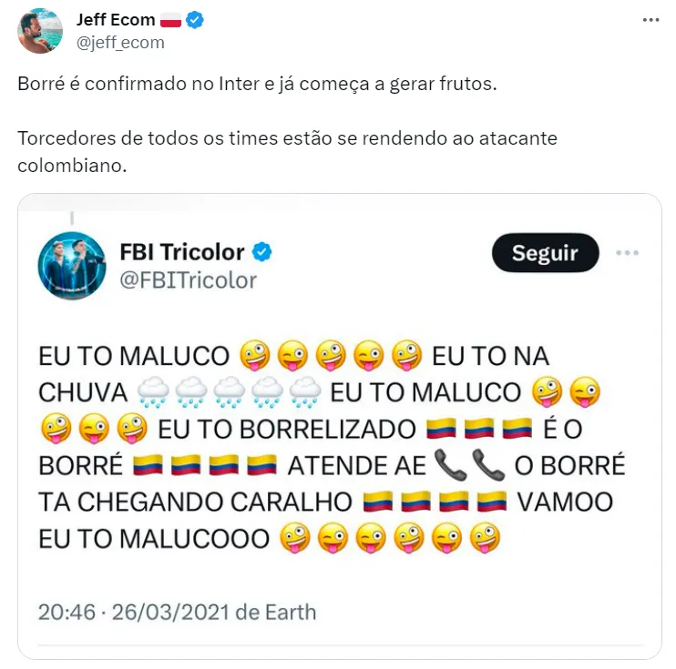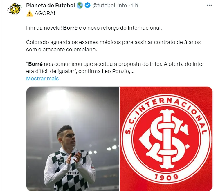 Borré será o grande reforço do Internacional para a temporada de 2024 e também um dos maiores do futebol brasileiro. O atacante de 28 anos de idade chega com muita moral para reforçar o time de Coudet.