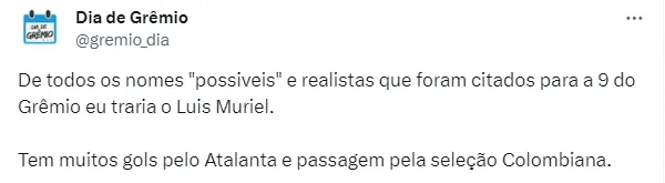 Neste tempo em que o Grêmio está em busca de um novo 9, Muriel, inclusive, foi ventilado. Entretanto, pelas notícias, parece que não agradou à comissão técnica e acabou sendo vetado.