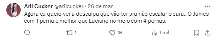 Até aqui, foram somente quatro partidas com 74 minutos no São Paulo, já pela Seleção atuou em 118 em dois jogos. O jogador retorna ao CT da Barra Funda nesta sexta (29) e resta saber se o treinador dará essa tão sonhada oportunidade que James quer.
