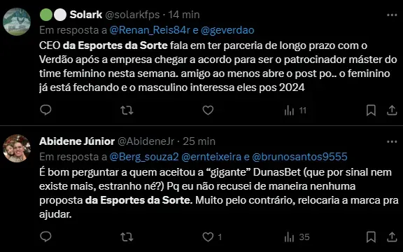 “Já deixamos claro nosso interesse em aumentar a parceria no futuro para o time masculino, com mais investimentos, já que hoje o contrato contempla apenas algumas propriedades”, acrescentou.