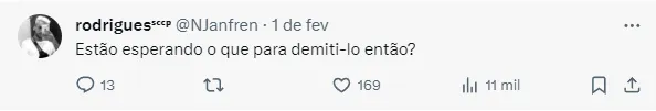O atual contrato do treinador tem multa fixada em R$ 20 milhões, valor que comprometeria ainda mais as finanças do Corinthians neste momento. Ainda assim, grande parte da Fiel pede pela saída do técnico.
