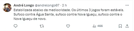 Nos últimos jogos, a equipe não apresentou um bom futebol. Contra o Água Santa, o empate em 3 a 3 quase custou a eliminação na Copa do Brasil. Além das duas partidas contra o Nova Iguaçu, onde sofreu bastante defensivamente e nas criações de jogadas.