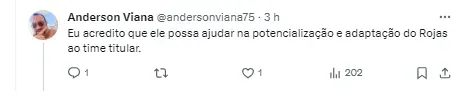 Além disso, chega até mesmo para ser um substituto de Matías Rojas. O que o torcedor corintiano esperava do paraguaio, não conseguiu ver o desempenho. São jogadores parecidos, mas Rojas que já está no elenco, por exemplo, não conseguiu apresentar.