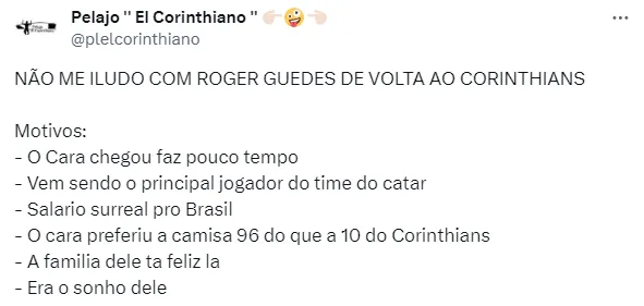 O jornalista ainda diz que o Timão poderia arcar com algo na casa de 10 milhões de euros. Entretanto, os salários de ‘outro mundo’ recebidos por Guedes no Catar dificultam as coisas.