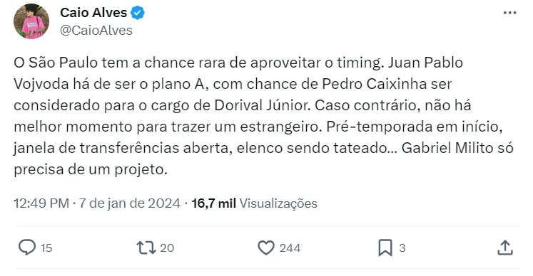 O contrato do português com o time paulista vai até 2025, após ele ter renovado no final da temporada. Não há informações sobre qualquer tipo de contato neste momento.