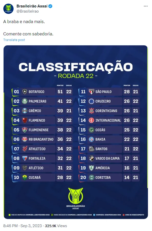 As equipes que perseguem, mesmo a certa distância, o Botafogo, são o Palmeiras, na vice-liderança, o Grêmio, que ocupa a terceira colocação, e o Flamengo, que fecha o G4 do Brasileirão.