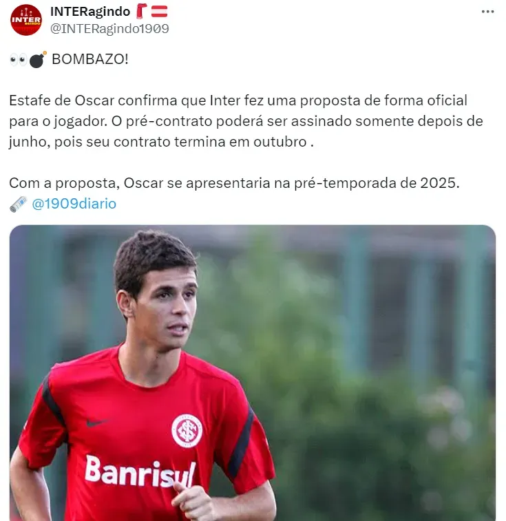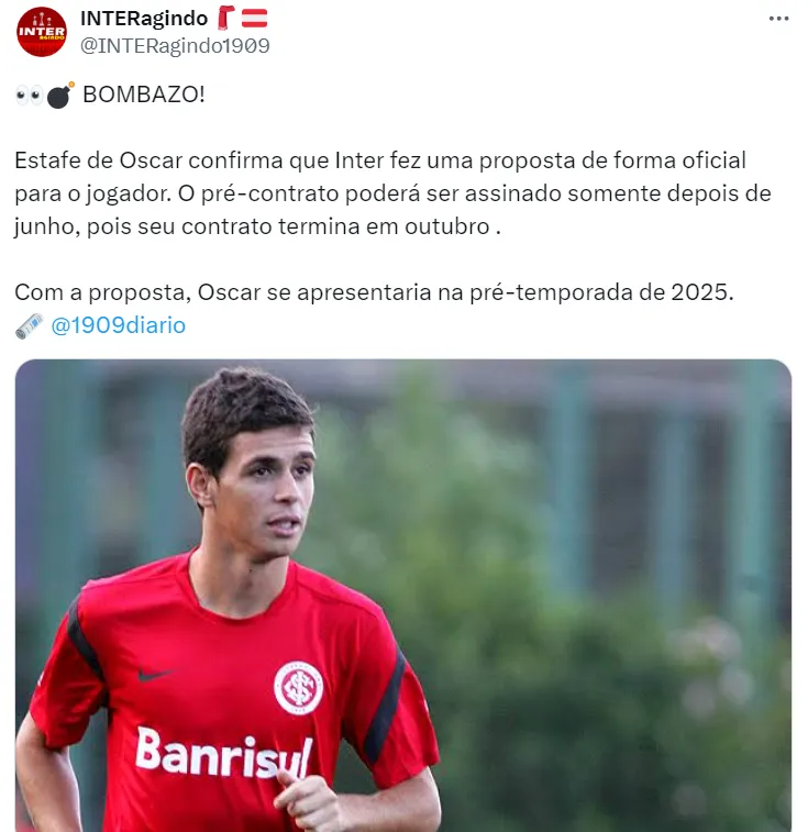 Sem informações sobre qualquer interesse dos Blues, o jogador teria sinalizado positivamente para voltar ao Internacional em 2025, conforme informa Rafael Ribeiro.
