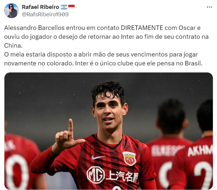 São grandes as chances do meia Oscar vestir vermelho em sua volta ao futebol brasileiro. O meia, de 32 anos de idade, está de saída do futebol chinês e vê o Brasil como uma grande oportunidade.