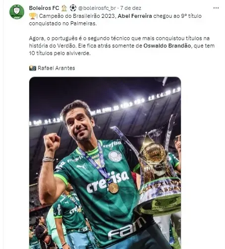 “Ele [Abel] é o maior da história do Palmeiras, porque ele é o único a ganhar nove títulos em uma passagem. O Brandão ganhou 10. O Brandão é o técnico mais vencedor da história do Palmeiras, mas o Brandão foi campeão 10 vezes em três passagens”, explicou PVC, destacando a singularidade da conquista de Abel Ferreira. “Significa que o Abel é melhor do que o Brandão? São outras épocas”, ponderou.