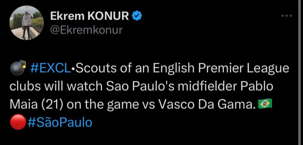 Segundo informações do jornalista Ekrem Konur, olheiros de equipes da Premier League estarão presentes na partida entre São Paulo e Vasco da Gama, para observar Pablo Maia. Os clubes não foram revelados pelo jornalista.