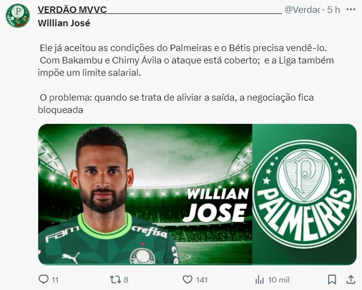 Willian José tem contrato com o time de LaLiga até o ano de 2026 e por ser um atacante importante do elenco, o clube de Sevilla entende que é necessário o Palmeiras subir a oferta para topar negócio.