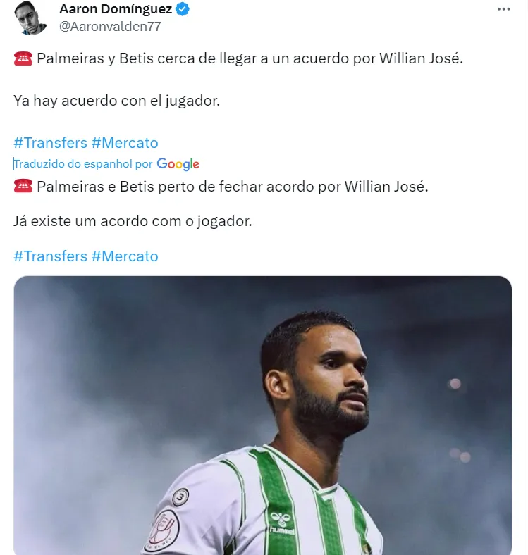 A informação foi passada por Aoron Domínguez em seu Twitter. E, de acordo com sua fonte, há um acordo entre o centroavante brasileiro e o Palmeiras. Segundo informou, o clube paulista e o Real Betis estão perto de um desfecho.