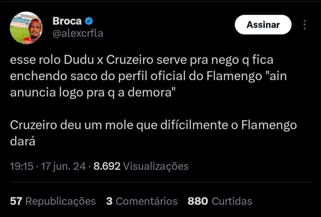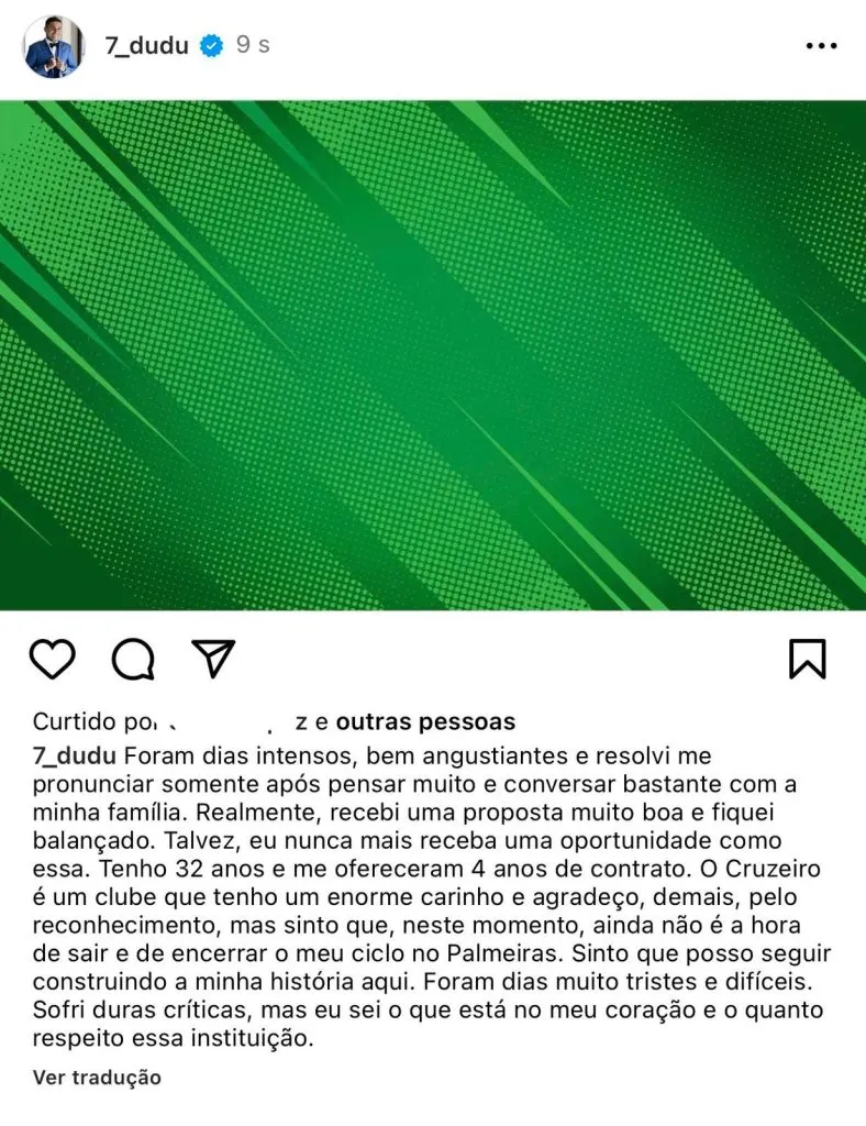 Através das suas redes sociais oficiais, Dudu resolveu falar pela primeira vez sobre sua transferência para o Cruzeiro. Segundo o ponta, ele decidiu voltar atrás no acordo após ver que ainda não é a hora de acabar sua história no Verdão.