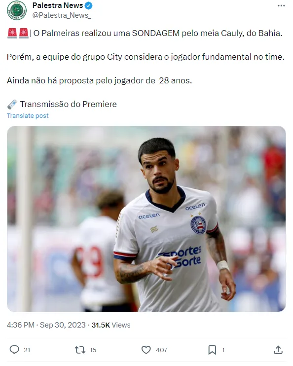 Além da possível chegada de Bruno Henrique, o Palestra News relata que o clube está monitorando a situação de Cauly, meio-campista do Bahia. O Palmeiras está de olho nessas possíveis adições para reforçar seu elenco para o ano de 2024.