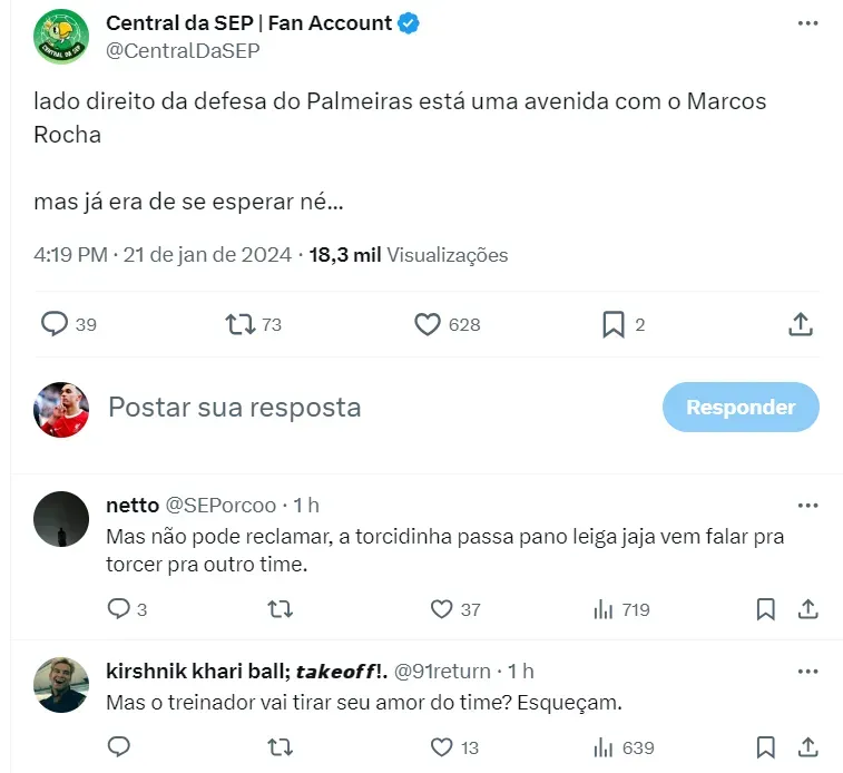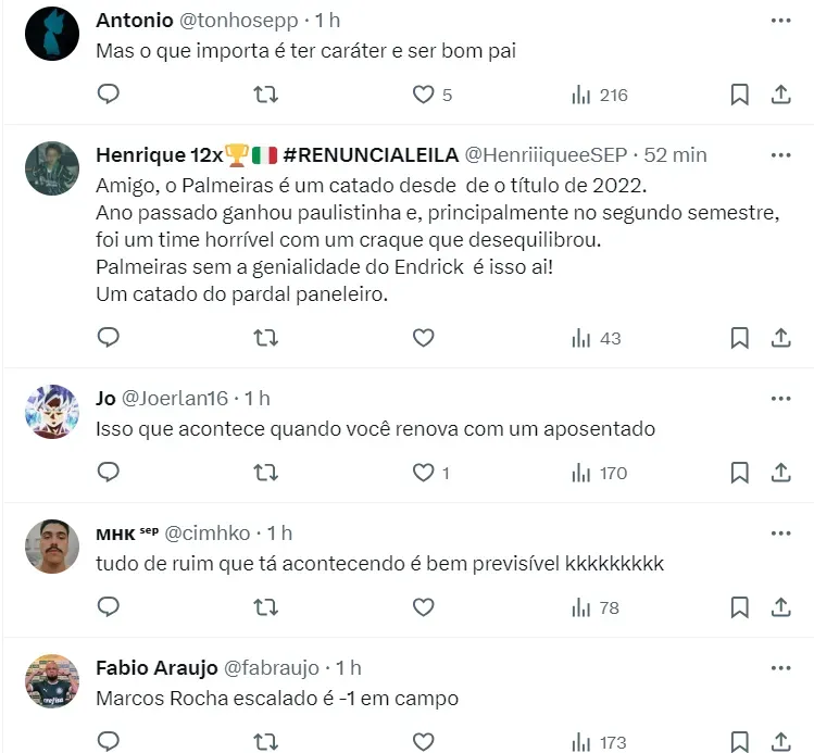 “O lado direito do Palmeiras está uma avenida com o Marcos Rocha, mas já era de se esperar, né…”, diz outro torcedor do time paulista sobre a atuação do jogador pelo Paulistão.