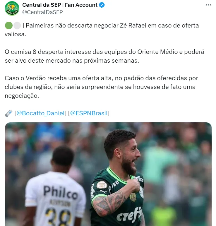 Os clubes interessados em Zé Rafael não foram revelados, mas não é a primeira vez que o jogador do Verdão entra na mira do exterior. O contrato do ‘trem’ vai até 2026.
