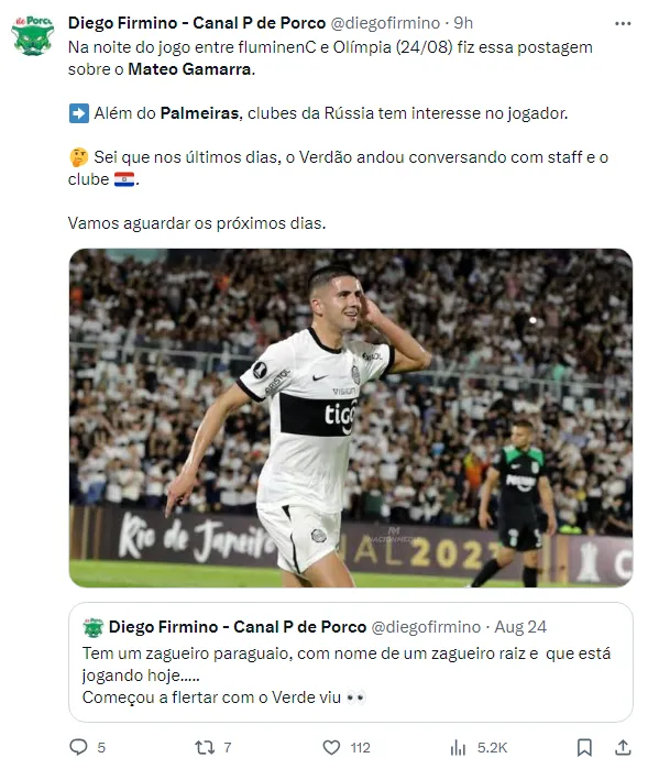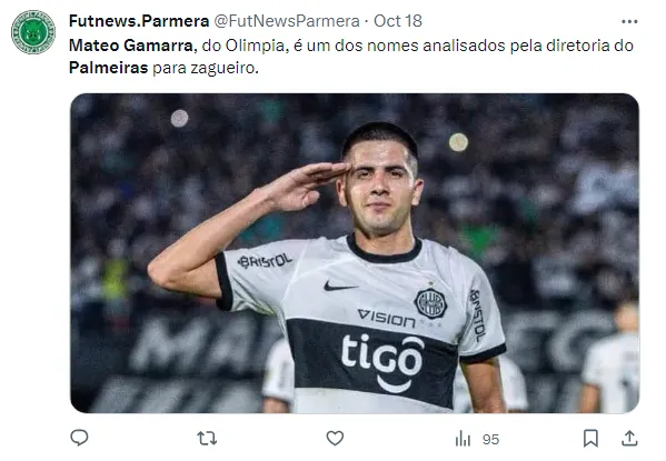 Recentemente, o nome de Mateo Gamarra, do Olímpia do Paraguai, voltou a figurar na lista de possíveis reforços para o Palmeiras, de acordo com o jornalista Diego Firmino.