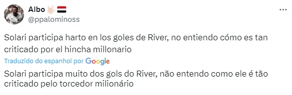 Atacante de lado, Solari foi contratado pelo River em 2022 e, desde então, apesar de algumas críticas, vem se consolidando como um dos principais nomes da equipe. Em 2024, soma 10 jogos disputados, com três gols e duas assistências.