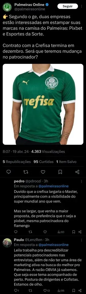 Esportes da Sorte, que já patrocina o futebol feminino do Palmeiras com valores em torno de R$ 20 milhões, e PixBet inicialmente são as mais interessadas em conversar sobre o rumo da SEP a partir de 2025.