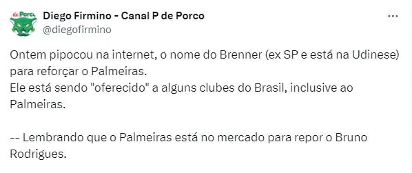 Diego Firmino conta que, nos últimos dias, o atacante Brenner tem sido oferecido a alguns times do Brasileirão. Um deles, seria o Palmeiras, que busca um substituto para Bruno Rodrigues.