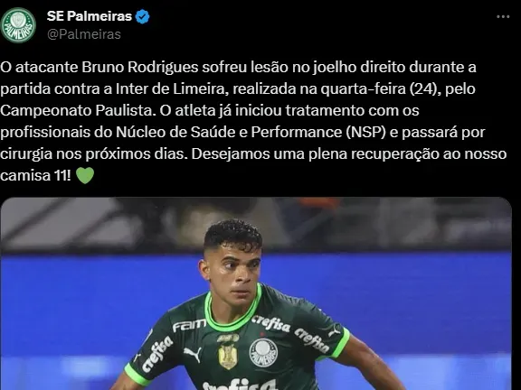 “O atacante Bruno Rodrigues sofreu lesão no joelho direito durante a partida contra a Inter de Limeira, realizada na quarta-feira (24), pelo Campeonato Paulista“, iniciou o comunicado.