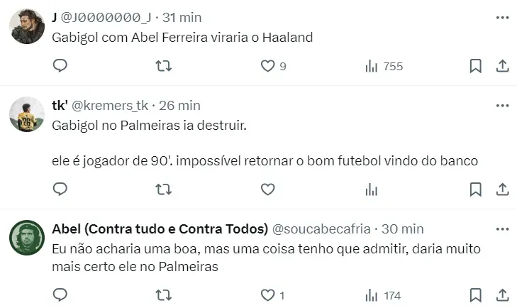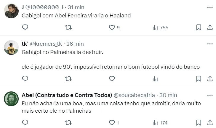 “O Palmeiras não pode admitir de forma pública, pois não quer atrito com o Flamengo e isso iria gerar mais dificuldades. Porém, o Palmeiras monitora a situação do Gabigol, pensando em contratar de graça para janeiro de 2025. O Gabigol não fica no Flamengo, foi o que me disseram”, disse a fonte.