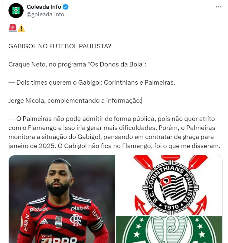 Segundo ele, a ideia do Verdão é contratar Gabigol a custo zero em janeiro de 2025, quando ele ficará sem contrato com o Flamengo. Ele ainda completa dizendo que Gabi não fica no Rio de Janeiro.