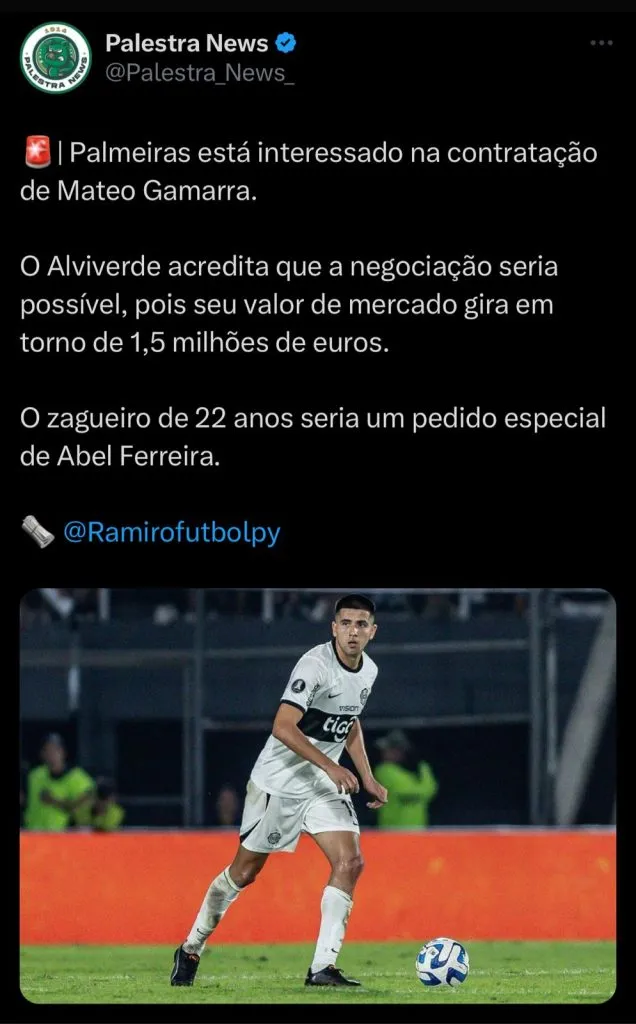 Segundo informações do jornalista Ramiro Aranda, e repassada pelo portal Palestra News, o Palmeiras estaria interessado na contratação do zagueiro Mateo Gamarra, do Olimpia.