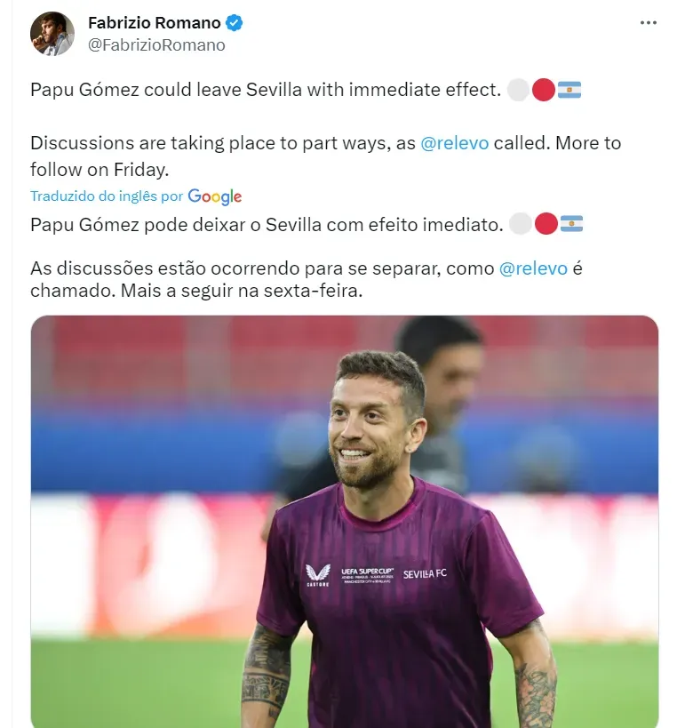 Segundo informações de Fabrizio Romano, Papu Gómez está em conversas com o Sevilla para deixar o clube nas próximas horas. O jornalista não entra em maiores detalhes, mas frisa que as conversas estão acontecendo entre as partes
