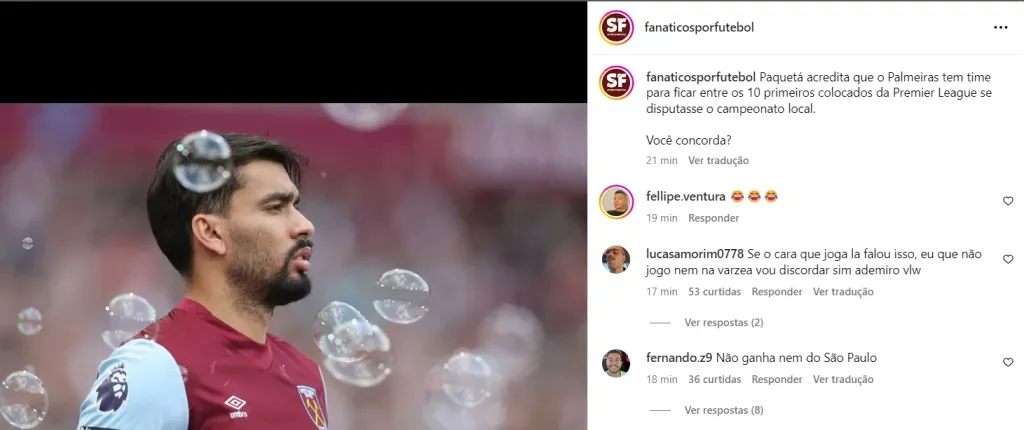Na mesma entrevista, o jogador do West Ham surpreendeu ao falar sobre qual a posição que o Palmeiras, atual campeão brasileiro, terminaria na Premier League se disputasse o campeonato local.