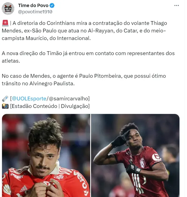 De acordo com informações de Carlo Cereto, Thiago Mendes é o mais novo alvo para reforçar o meio-campo do Corinthians em 2024. Atualmente, o volante defende as cores do Al-Rayyan, do futebol do Catar. O meia Maurício, do Inter, também é alvo.