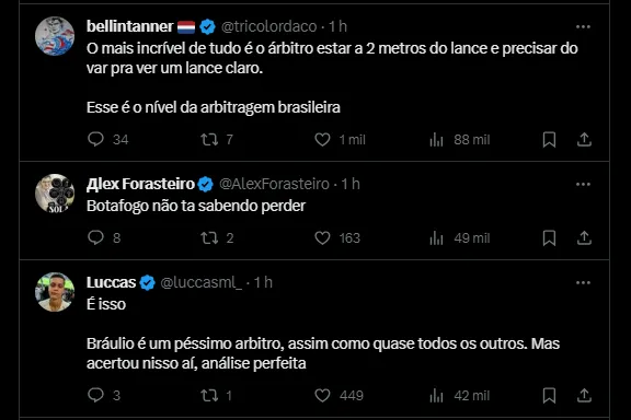 O lance gerou discussão nas redes sociais, mas tudo acabou quando o áudio do VAR veio à tona através do site oficial da Confederação Brasileira de Futebol (CBF). O diálogo foi transcrito abaixo.