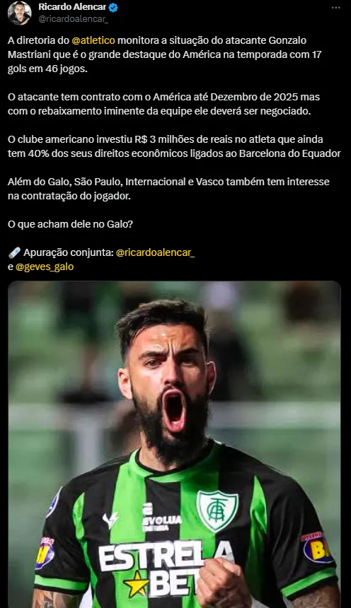 De acordo com as informações publicadas pelo jornalistas Marcos Geves e Ricardo Alencar, o Atlético Mineiro tem interesse na contratação do atacante Gonzalo Mastriani, que joga atualmente no América-MG.