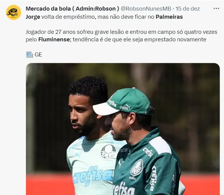 Jorge esteve emprestado ao Fluminense neste ano, mas não conseguiu jogar devido a lesões. No Palmeiras, ele também nunca teve uma boa sequência, diferente da sua passagem pelo mesmo Santos, em 2019. A informação é do Lance.