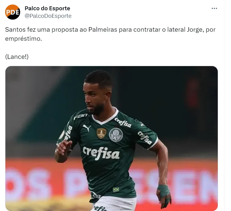 De saída do Palmeiras, o lateral Jorge recebeu uma oferta para defender as cores do Santos em 2024 na Série B. O defensor não encontra-se nos planos de Abel Ferreira, e deixará o clube.