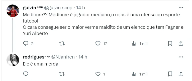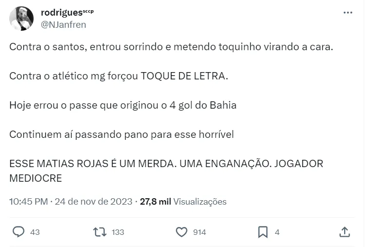 “Contra o Santos, entrou sorrindo e metendo toquinho virando a cara. Contra o Atlético MG, forçou toque de letra. Hoje (contra o Bahia) errou o passe que originou gol do Bahia. Continuem passando pano para esse horrível”, diz um torcedor do Timão.