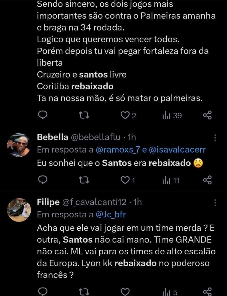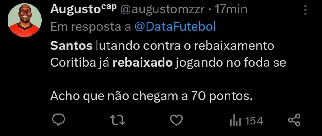 “Rebaixados: Santos, Goiás, Coritiba e América-MG. Fiz imparcialmente. O Flamengo assumiu a liderança na última rodada, derrotando o São Paulo no Morumbi”.