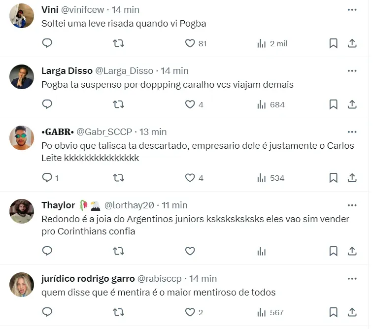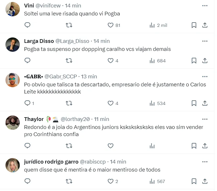 Na web, a torcida do Timão reagiu a informação de Pogba no clube e boa parte deles não acreditam de maneira alguma em uma possível contratação do astro francês.