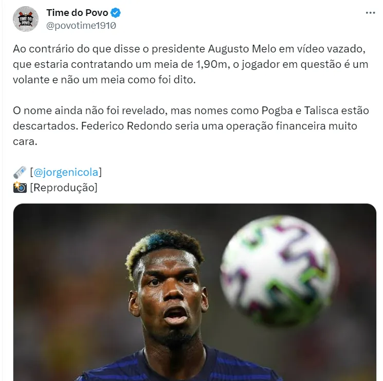 Com o nome ventilado no Timão, Jorge Nicola informou que não há sequer nenhuma possibilidade de Pogba ser o grande contratado do presidente Augusto Melo.