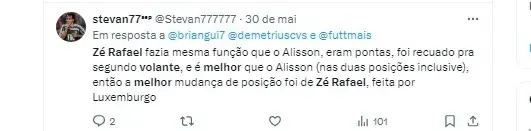 Durante uma dinâmica de resposta rápidas o ex-jogador foi perguntado qual seria o melhor jogador da atualidade que atua em sua posição e ele rapidamente respondeu: “Zé Rafael”.