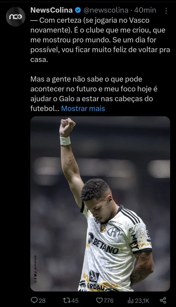 “Com certeza (se jogaria no Vasco novamente). É o clube que me criou, que me mostrou pro mundo. Se um dia for possível, vou ficar muito feliz de voltar pra casa”, inicou o camisa 10 do Galo.