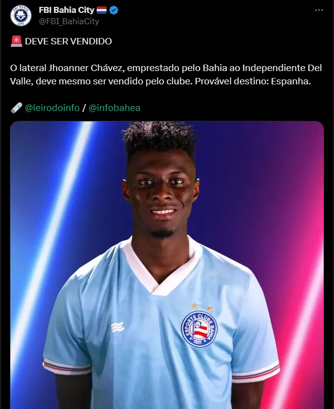 De acordo com as informações publicadas por João Gabriel Leiro, do portal “Info Bahia”, o Bahia está perto de acertar a venda do lateral-esquerdo Jhoanner Chávez para um clube de Espanha cujo nome ainda não foi revelado.