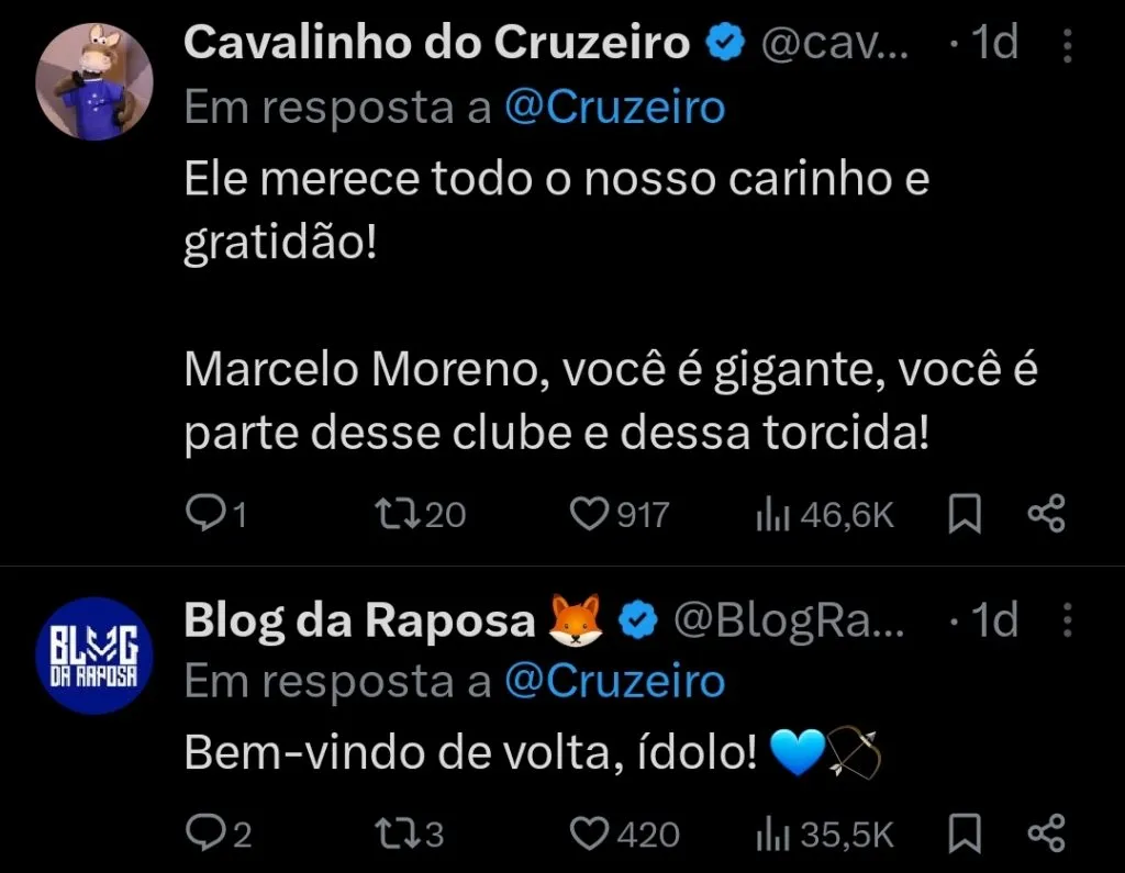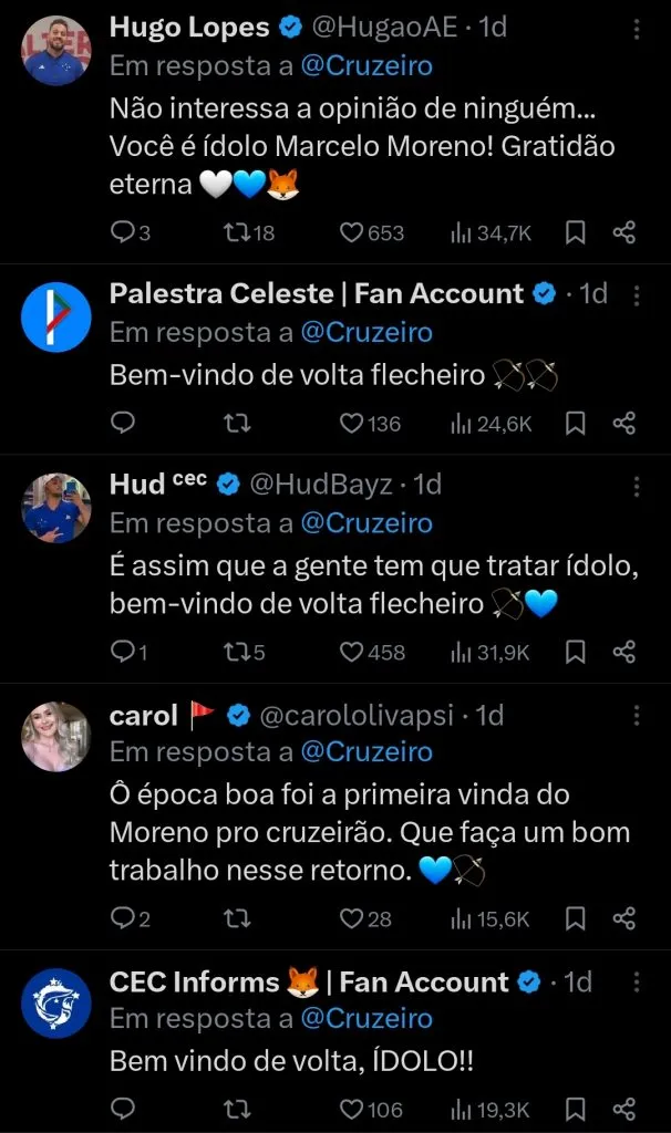 Dados e estatísticas do site Transfermarkt dão conta que Moreno tem 43 gols e sete assistências em 122 jogos disputados com a camisa celeste. A equipe de BH é a que ele mais marcou gols em toda a carreira.